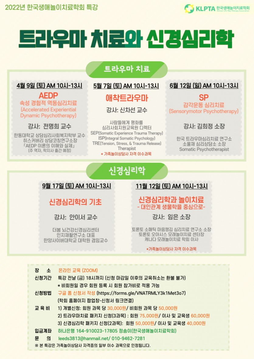 계속되는 코로나 재확산으로 인해 본 학회에서 비대면 온라인으로 트라우마치료와 신경심리학을 주제로 하여 특강을 진행합니다.